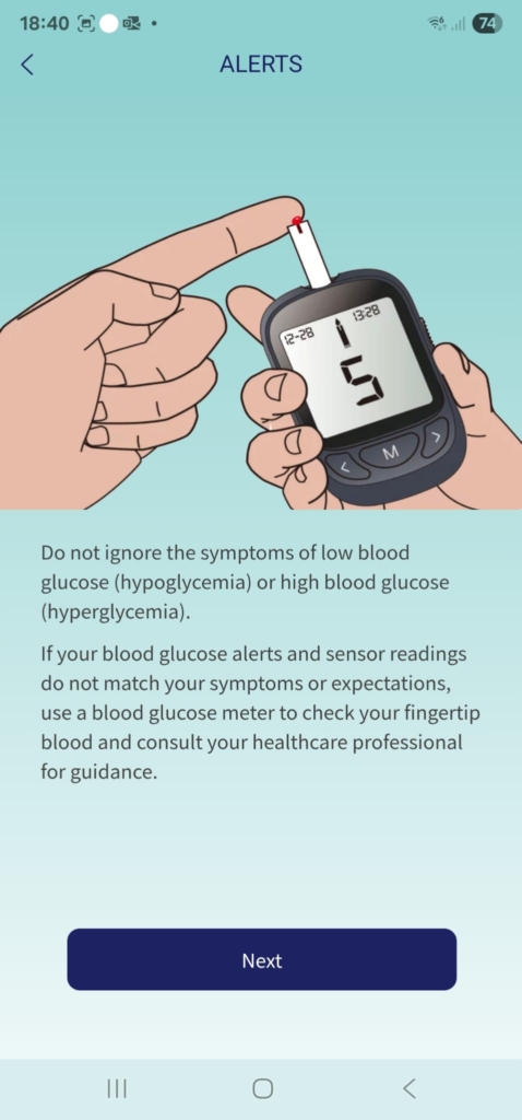 When logging in for the first time, the app guides you through initial setup. Follow the on-screen instructions carefully to ensure that glucose data and alerts are received correctly: