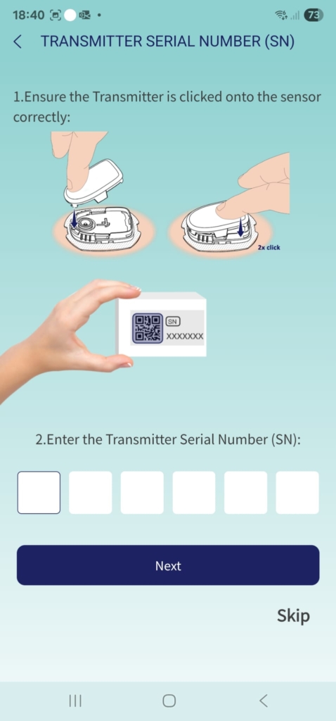 The transmitter sends your continuous glucose readings to the GlucoSensor™ App via Bluetooth. During first-time setup, follow the on-screen steps, read the warnings carefully, then either enter the serial number (SN) manually or scan the QR code on the package to begin pairing.