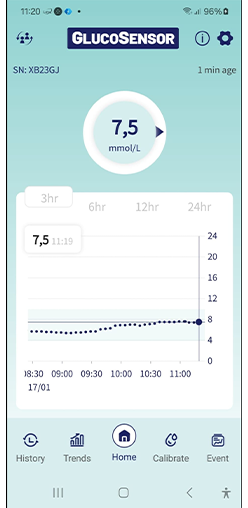- Home Dashboard – Displays your current glucose level in real time and shows glucose trends on a graph. You can select time intervals of 3, 6, 12, or 24 hours.