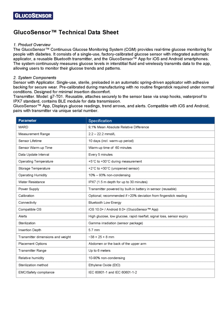 - GlucoSensor™ App – for iOS and Android, providing real-time data, alerts, reports, and sharing options.